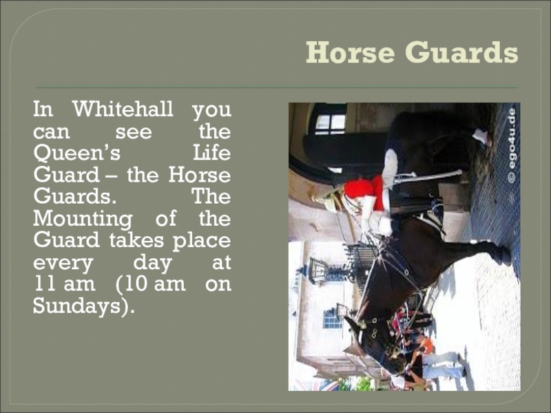 Horse Guards. The Mounting of the Guard takes place every day at 11 am (10 am on Sundays).