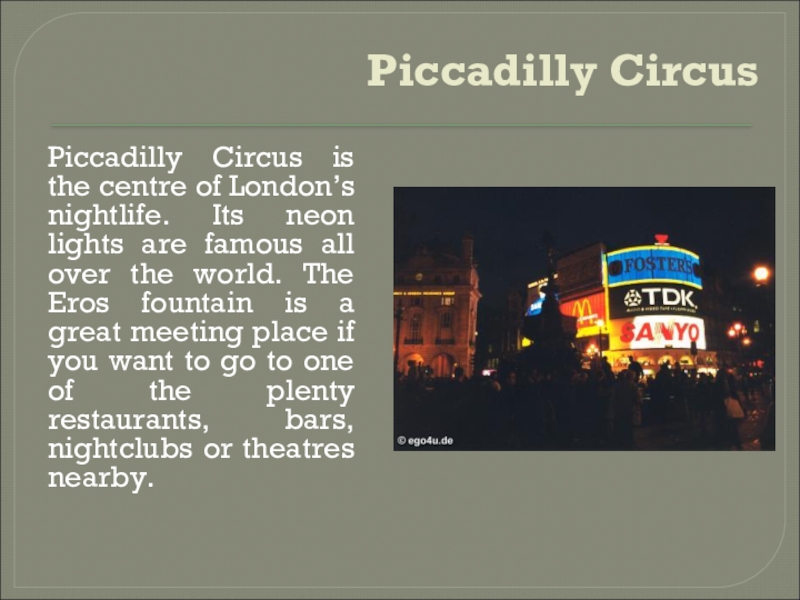 lights are famous all over the world. The Eros fountain is a great meeting place if you want to go to one of the plenty restaurants, bars, nightclubs or theatres nearby.