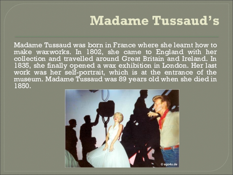 to make waxworks. In 1802, she came to England with her collection and travelled around Great Britain and Ireland. In 1835, she finally opened a wax exhibition in London. Her last work was her self-portrait, which is at the entrance of the museum. Madame Tussaud was 89 years old when she died in 1850.