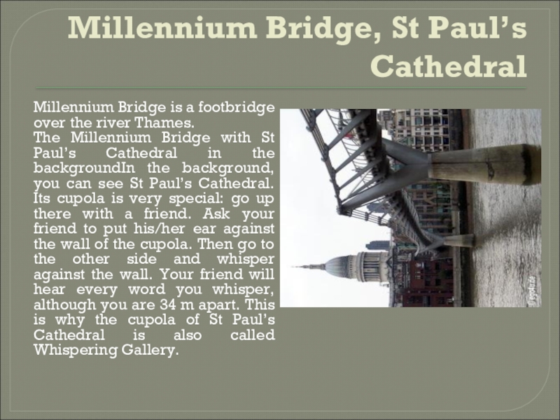 The Millennium Bridge with St Paul’s Cathedral in the backgroundIn the background, you can see St Paul’s Cathedral. Its cupola is very special: go up there with a friend. Ask your friend to put his/her ear against the wall of the cupola. Then go to the other side and whisper against the wall. Your friend will hear every word you whisper, although you are 34 m apart. This is why the cupola of St Paul’s Cathedral is also called Whispering Gallery.