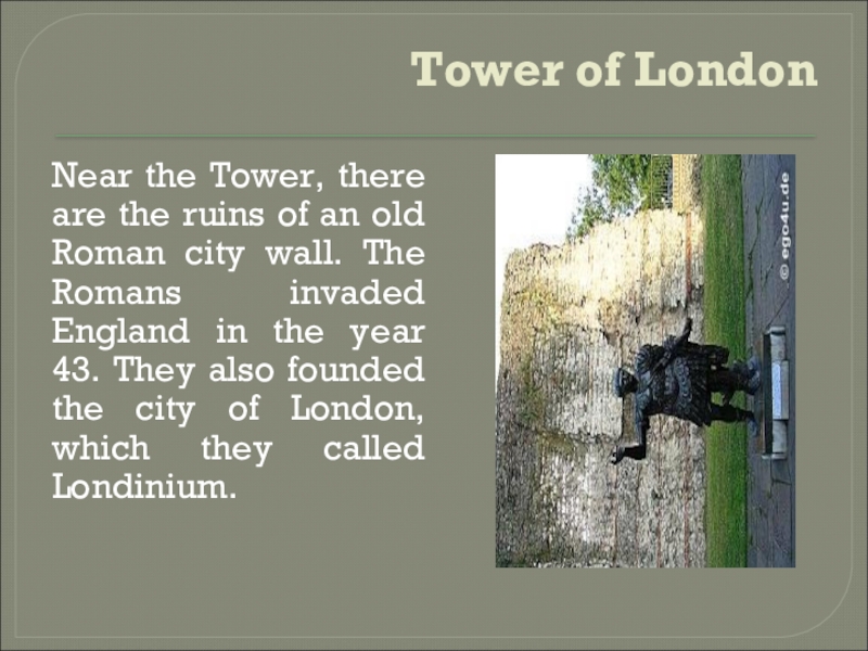 old Roman city wall. The Romans invaded England in the year 43. They also founded the city of London, which they called Londinium.