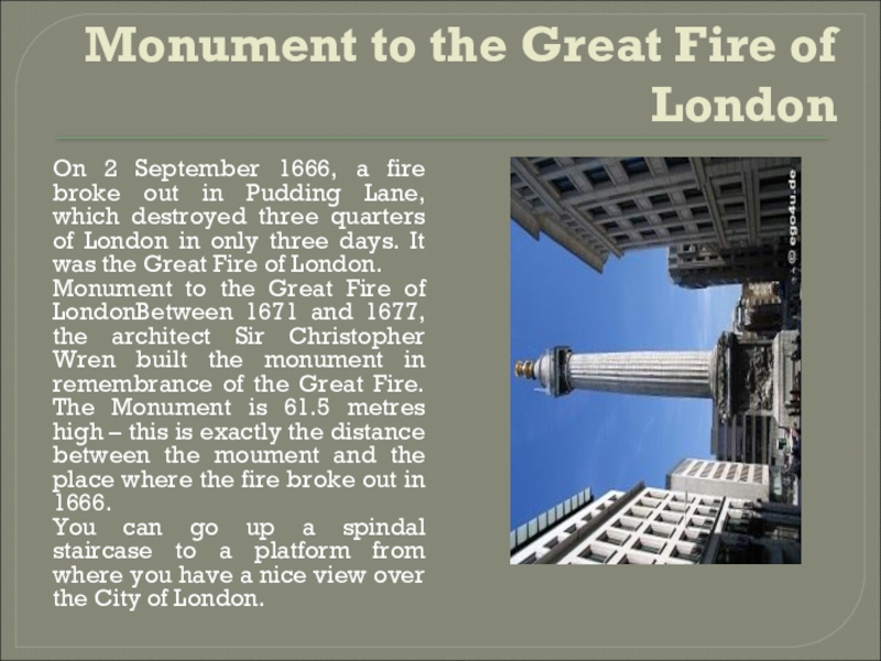 Monument to the Great Fire of LondonBetween 1671 and 1677, the architect Sir Christopher Wren built the monument in remembrance of the Great Fire. The Monument is 61.5 metres high – this is exactly the distance between the moument and the place where the fire broke out in 1666.