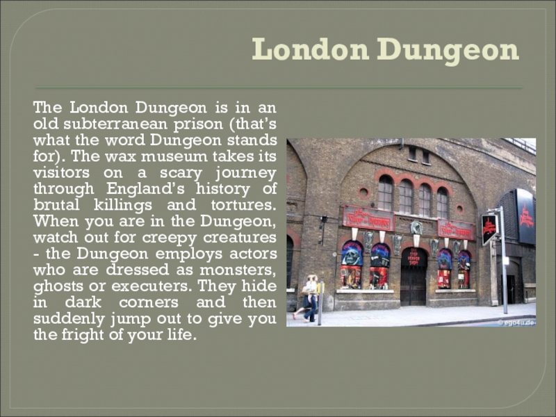 what the word Dungeon stands for). The wax museum takes its visitors on a scary journey through England’s history of brutal killings and tortures. When you are in the Dungeon, watch out for creepy creatures - the Dungeon employs actors who are dressed as monsters, ghosts or executers. They hide in dark corners and then suddenly jump out to give you the fright of your life.