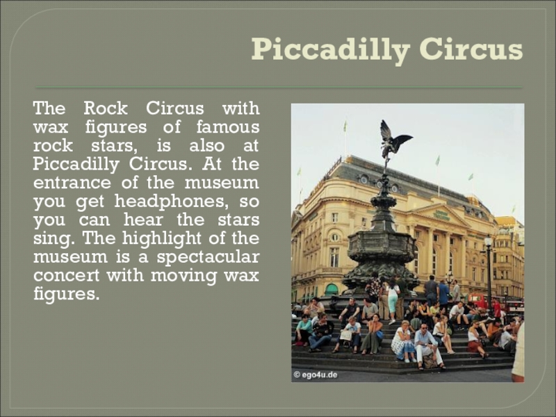 is also at Piccadilly Circus. At the entrance of the museum you get headphones, so you can hear the stars sing. The highlight of the museum is a spectacular concert with moving wax figures.