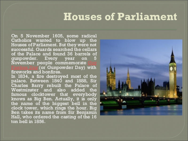 blow up the Houses of Parliament. But they were not successful. Guards searched the cellars of the Palace and found 36 barrels of gunpowder. Every year on 5 November people commemorate Guy Fawkes Day (or Gunpowder Day) with fireworks and bonfires.