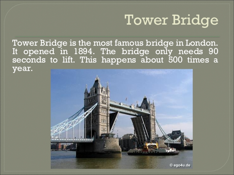 opened in 1894. The bridge only needs 90 seconds to lift. This happens about 500 times a year.