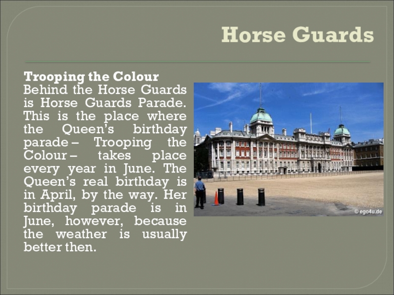 This is the place where the Queen’s birthday parade – Trooping the Colour – takes place every year in June. The Queen’s real birthday is in April, by the way. Her birthday parade is in June, however, because the weather is usually better then.
