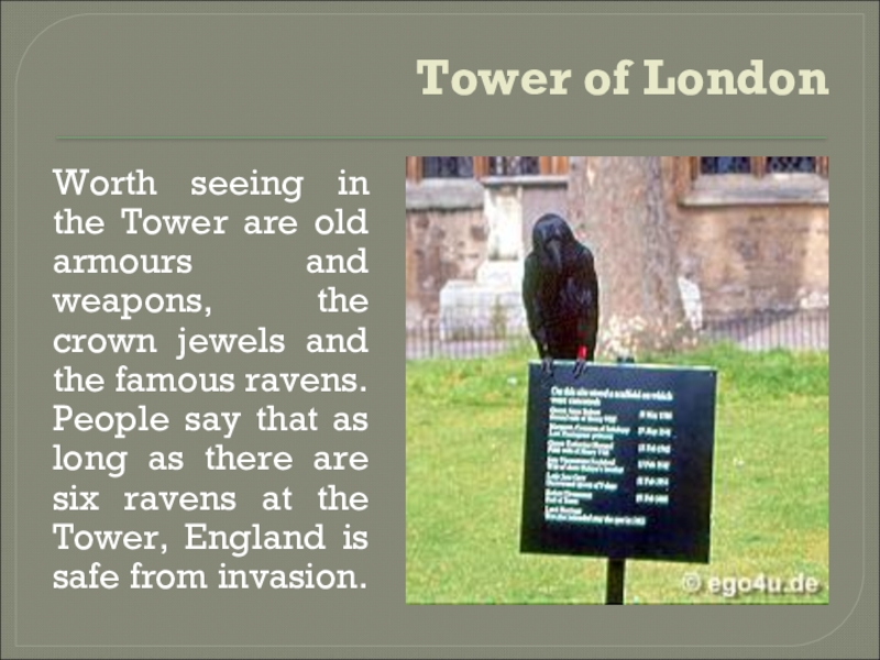 weapons, the crown jewels and the famous ravens. People say that as long as there are six ravens at the Tower, England is safe from invasion.