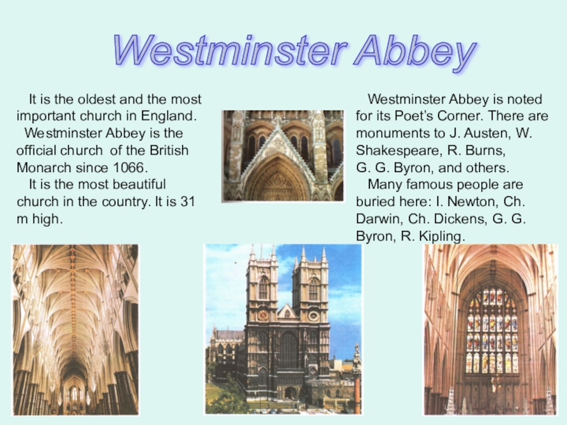 Many famous people are buried here: I. Newton, Ch. Darwin, Ch. Dickens, G. G. Byron, R. Kipling.