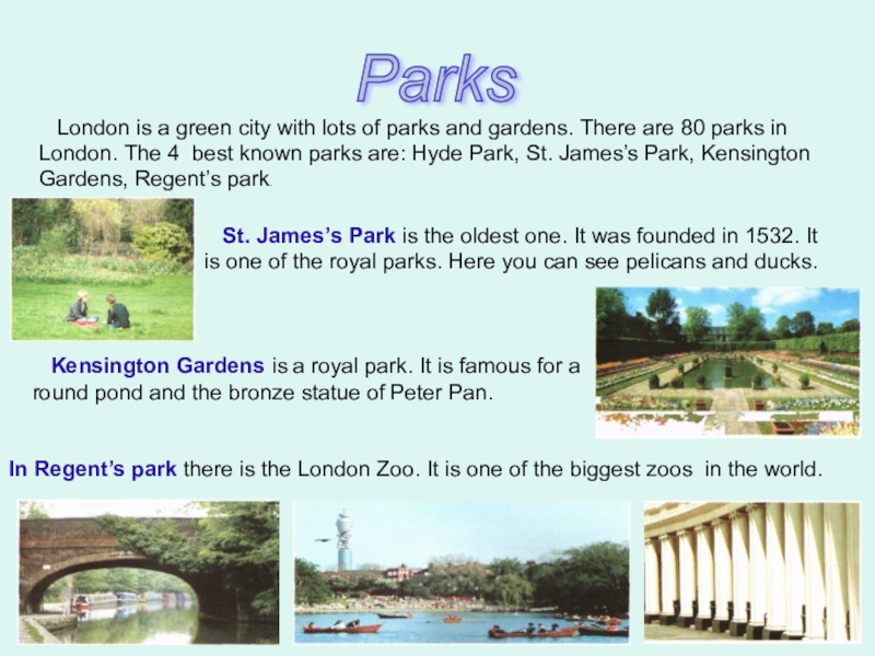 St. James’s Park is the oldest one. It was founded in 1532. It is one of the royal parks. Here you can see pelicans and ducks.