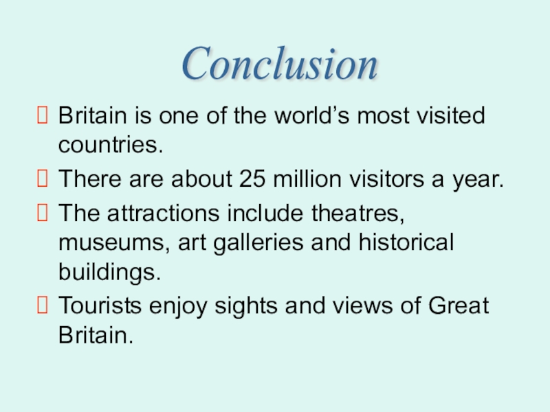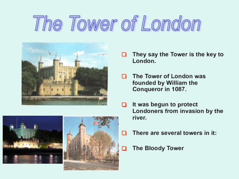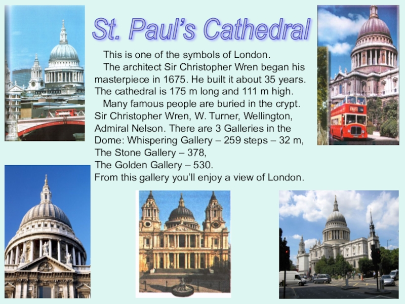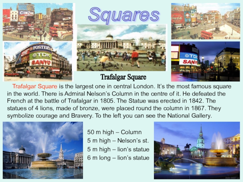 Trafalgar Square is the largest one in central London. It’s the most famous square in the world. There is Admiral Nelson’s Column in the centre of it. He defeated the French at the battle of Trafalgar in 1805. The Statue was erected in 1842. The statues of 4 lions, made of bronze, were placed round the column in 1867. They symbolize courage and Bravery. To the left you can see the National Gallery.
