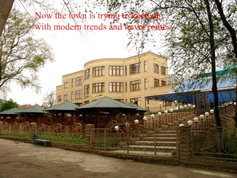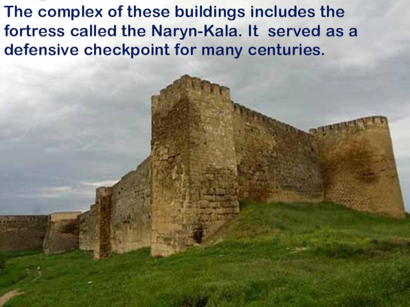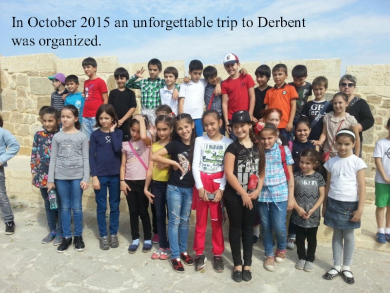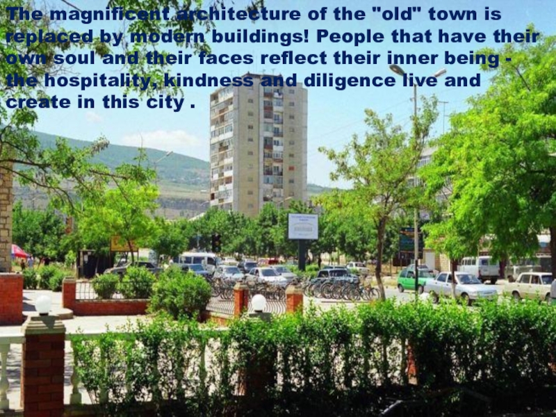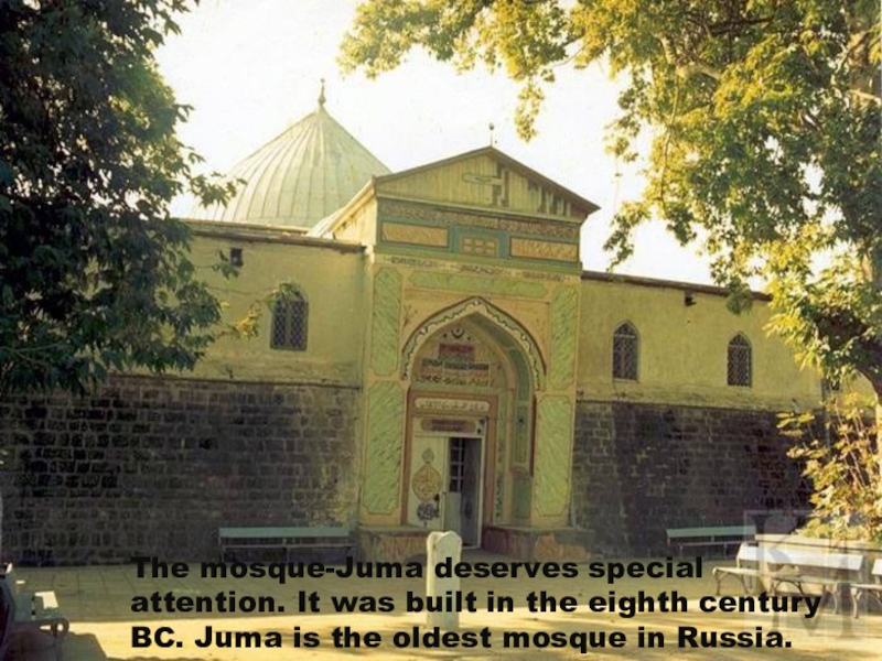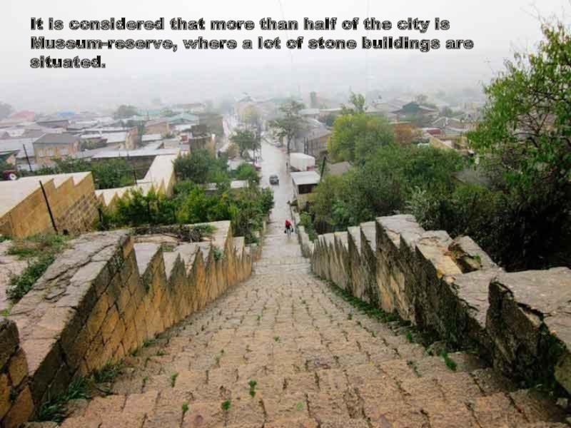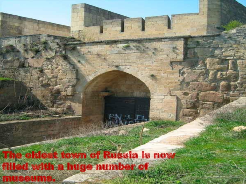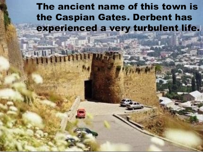 The town, about which I am going to speak, is situated between the Caspian sea and the most beautiful landscapes of the Caucasus mountains. It is the most ancient and the most southern town of our country. It is Derbent.