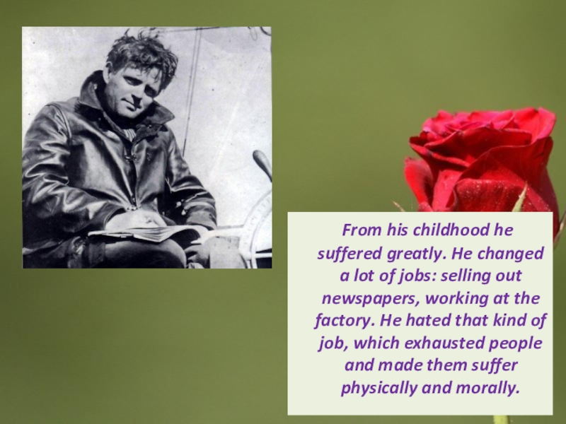 Jack London was born in 1876 in San Francisco, California. His family was very poor, so Jack had to leave school to make money.