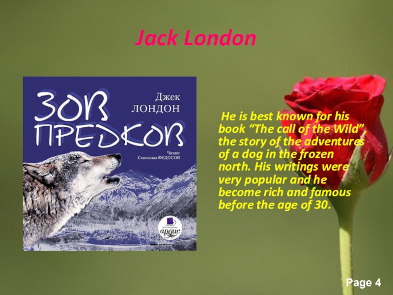 book “The call of the Wild”, the story of the adventures of a dog in the frozen north. His writings were very popular and he become rich and famous before the age of 30.