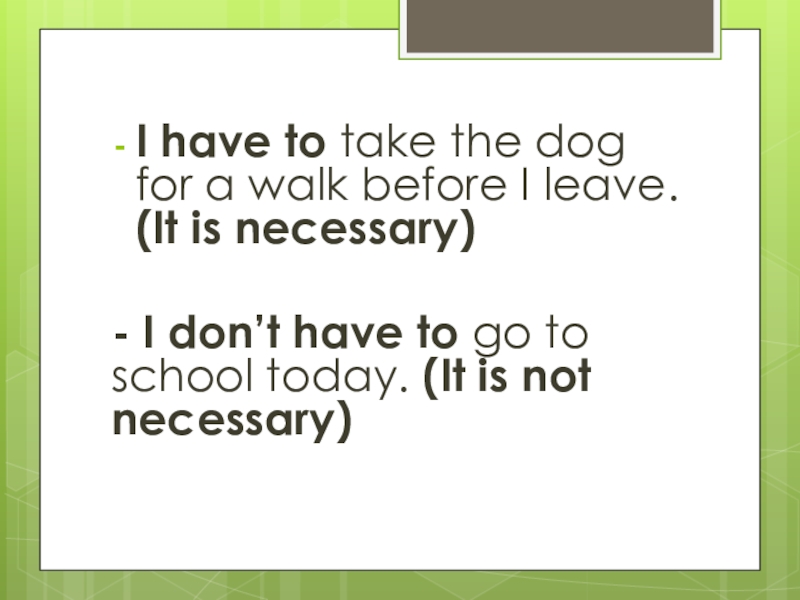 I have to take the dog for a walk before I leave. (It is necessary)- I don’t