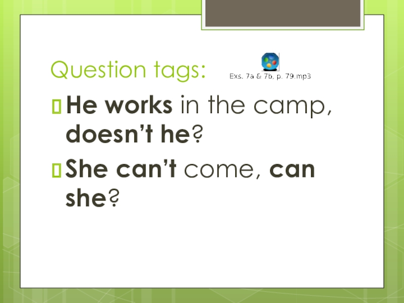 Question tags:He works in the camp, doesn’t he?She can’t come, can she?