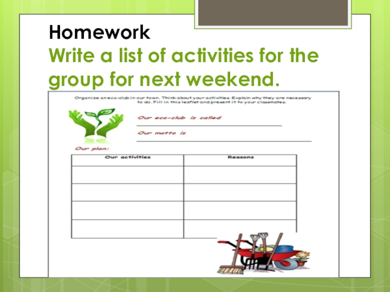 Слайд 14Homework Write a list of activities for the group for next weekend.