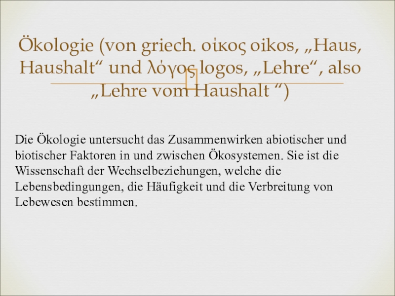 Die Ökologie untersucht das Zusammenwirken abiotischer und biotischer Faktoren in und zwischen Ökosystemen. Sie ist die Wissenschaft der Wechselbeziehungen, welche die Lebensbedingungen, die Häufigkeit und die Verbreitung von Lebewesen bestimmen.