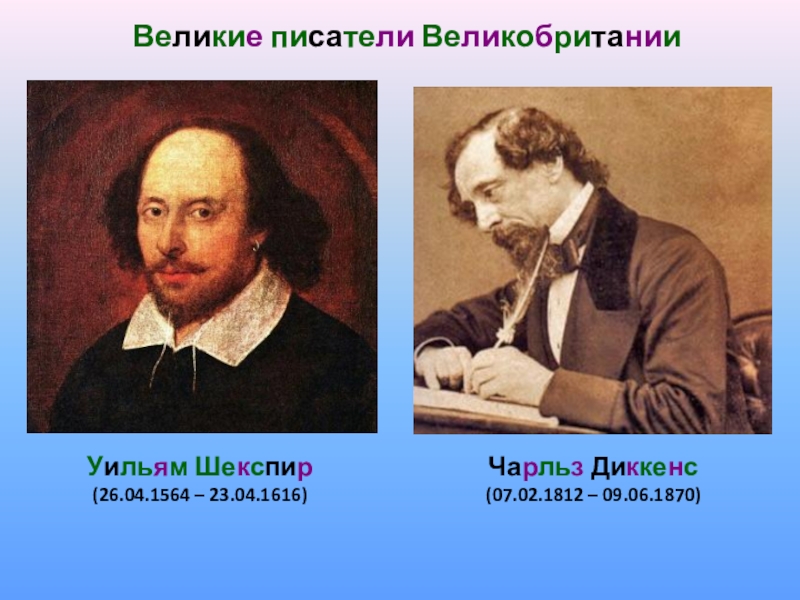 Великие писатели ВеликобританииУильям Шекспир(26.04.1564 – 23.04.1616)Чарльз Диккенс (07.02.1812 – 09.06.1870)