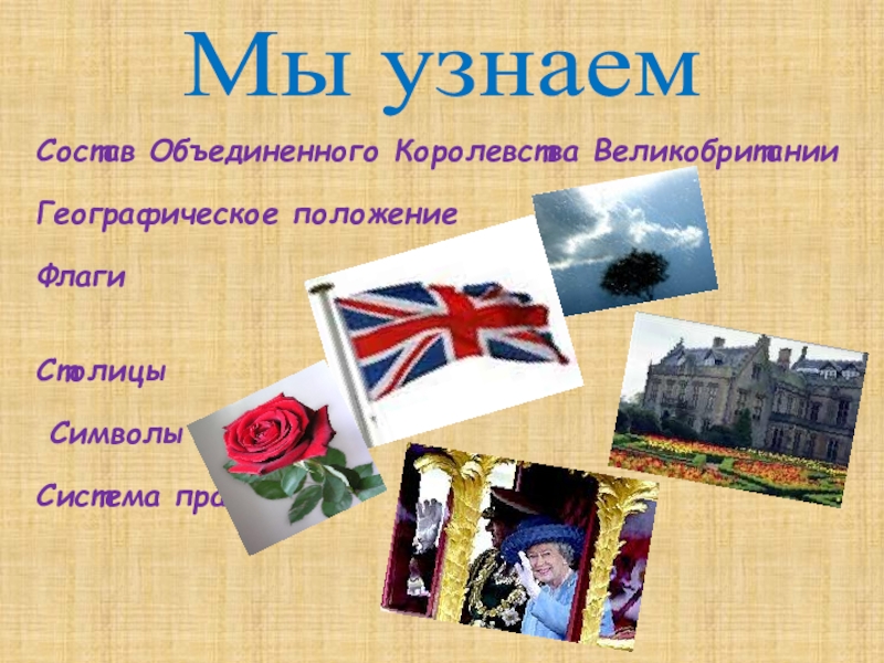 Состав Объединенного Королевства ВеликобританииГеографическое положениеФлагиСтолицы Символы Система правленияМы узнаем