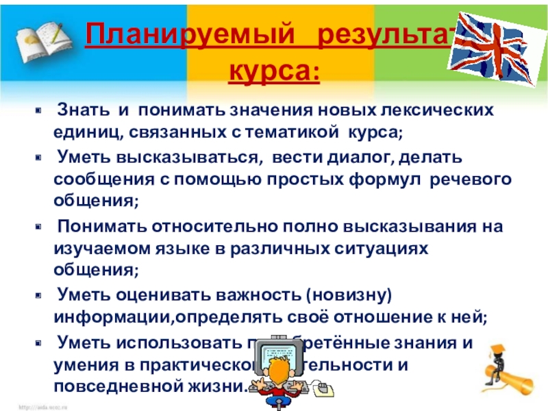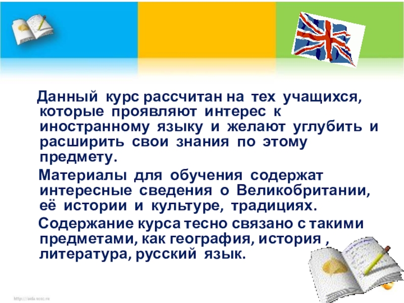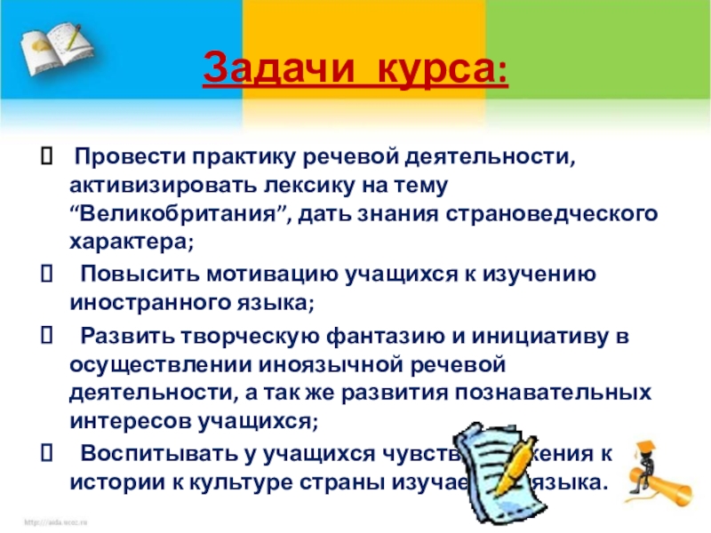 Задачи курса: Провести практику речевой деятельности, активизировать лексику на тему “Великобритания”, дать знания страноведческого характера;  Повысить