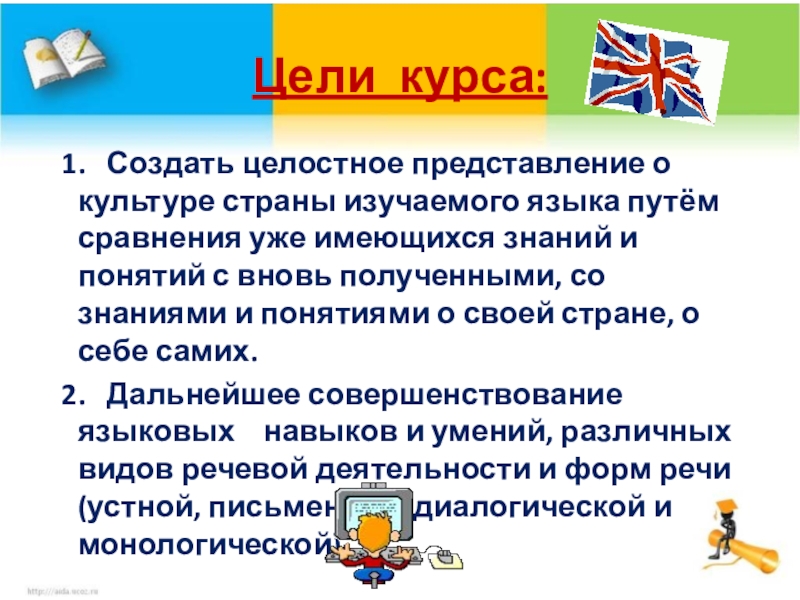 Цели курса: 1.  Создать целостное представление о культуре страны изучаемого языка путём сравнения уже имеющихся знаний