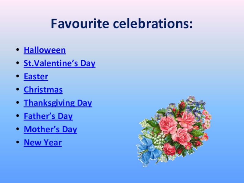 Favourite celebrations:HalloweenSt.Valentine’s DayEasterChristmasThanksgiving DayFather’s DayMother’s DayNew Year