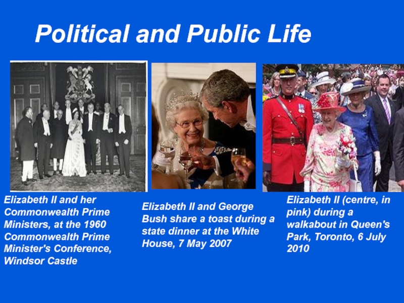 Elizabeth II and George Bush share a toast during a state dinner at the White House, 7 May 2007