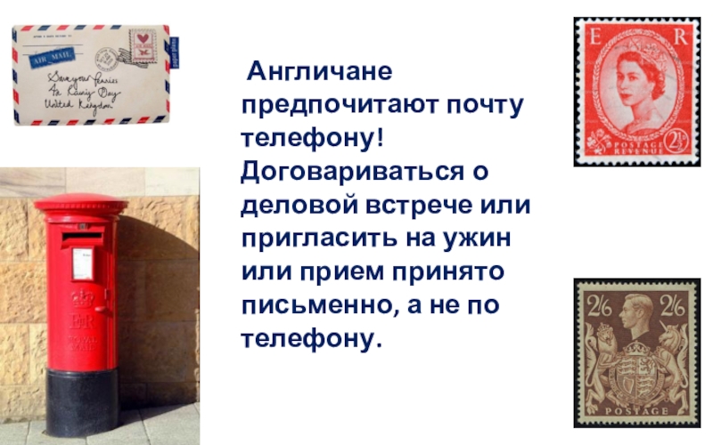 Слайд 7 Англичане предпочитают почту телефону! Договариваться о деловой встрече или пригласить на