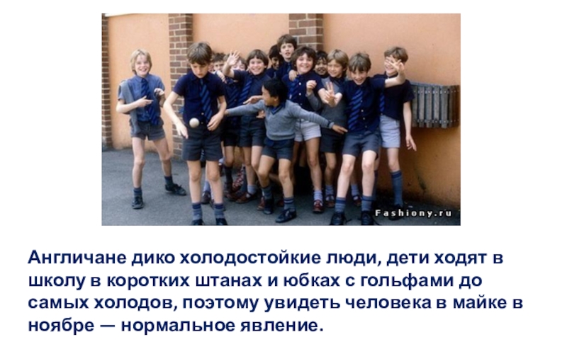 Слайд 8Англичане дико холодостойкие люди, дети ходят в школу в коротких штанах
