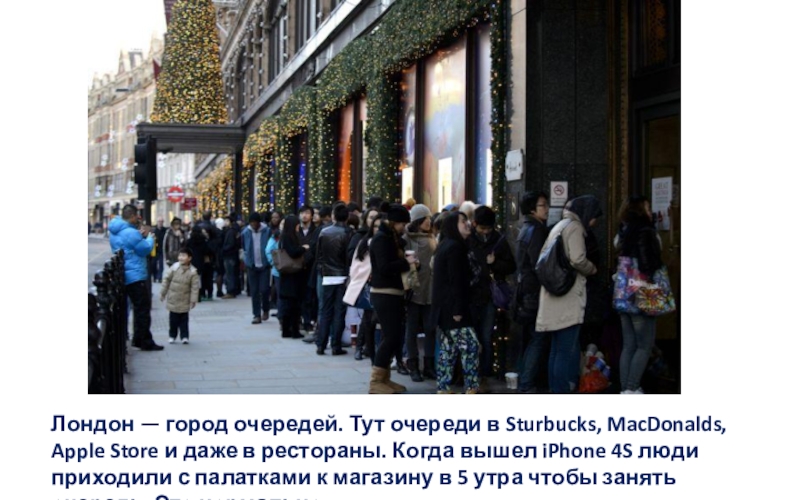 Слайд 18Лондон — город очередей. Тут очереди в Sturbucks, MacDonalds, Apple Store