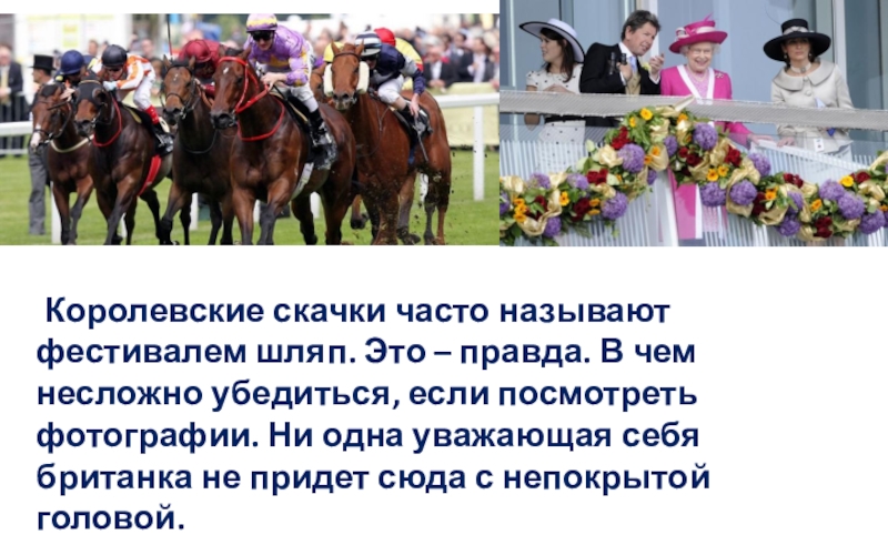 Слайд 20 Королевские скачки часто называют фестивалем шляп. Это – правда. В