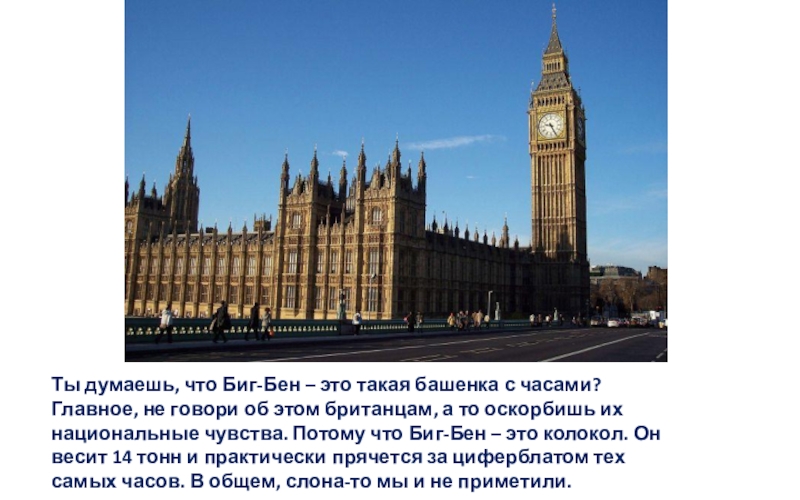 Слайд 19Ты думаешь, что Биг-Бен – это такая башенка с часами? Главное,
