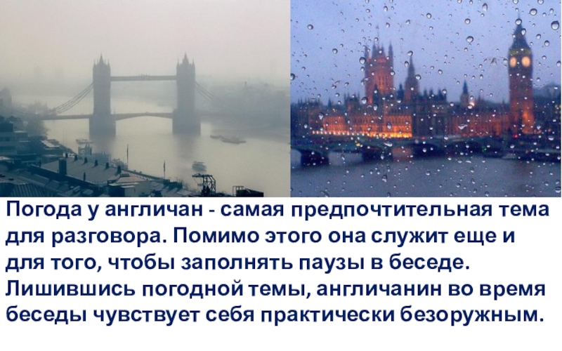 Слайд 6Погода у англичан - самая предпочтительная тема для разговора. Помимо этого
