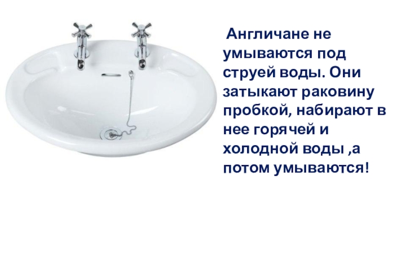 Слайд 5 Англичане не умываются под струей воды. Они затыкают раковину пробкой, набирают