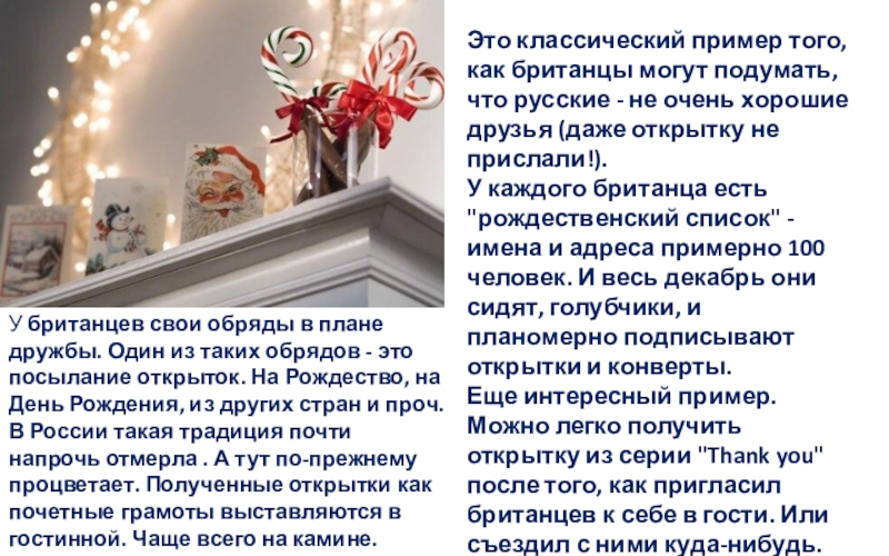 В России такая традиция почти напрочь отмерла . А тут по-прежнему процветает. Полученные открытки как почетные грамоты выставляются в гостинной. Чаще всего на камине.