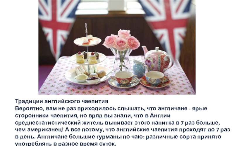 ярые сторонники чаепития, но вряд вы знали, что в Англии среднестатистический житель выпивает этого напитка в 7 раз больше, чем американец! А все потому, что английские чаепития проходят до 7 раз в день. Англичане большие гурманы по чаю: различные сорта принято употреблять в разное время суток.