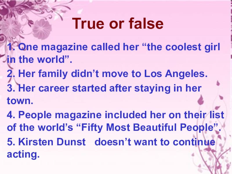 True or false 1. One magazine called her “the coolest girl in the world”.2. Her family