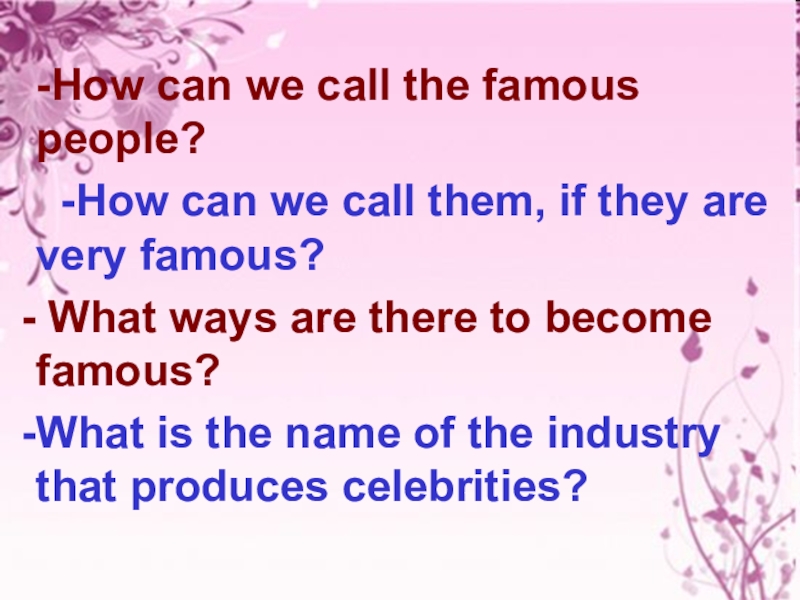 -How can we call the famous people? -How can we call them, if they are very famous? What ways are there to become famous? What is the name of the industry that produces celebrities?