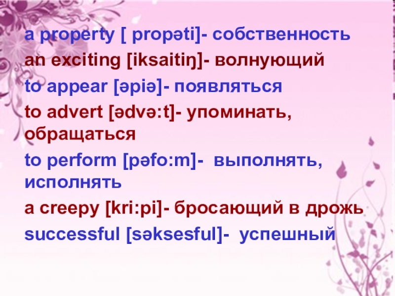 a property [ propəti]- собственностьan exciting [iksaitiŋ]- волнующийto appear [əpiə]- появлятьсяto advert [ədvə:t]- упоминать, обращатьсяto perform [pəfo:m]-