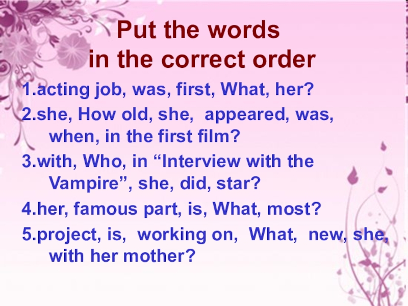 Put the words  in the correct order 1.acting job, was, first, What, her?2.she, How old, she,