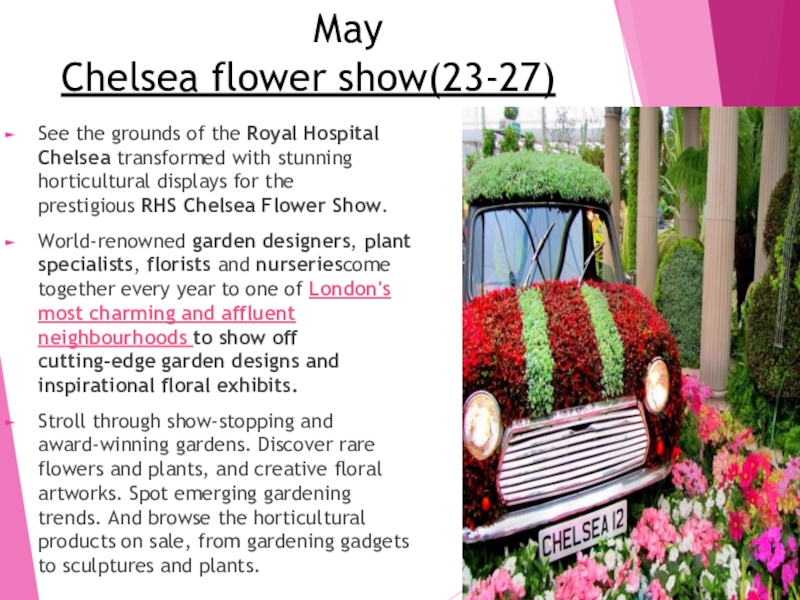 World-renowned garden designers, plant specialists, florists and nurseriescome together every year to one of London's most charming and affluent neighbourhoods to show off cutting-edge garden designs and inspirational floral exhibits.