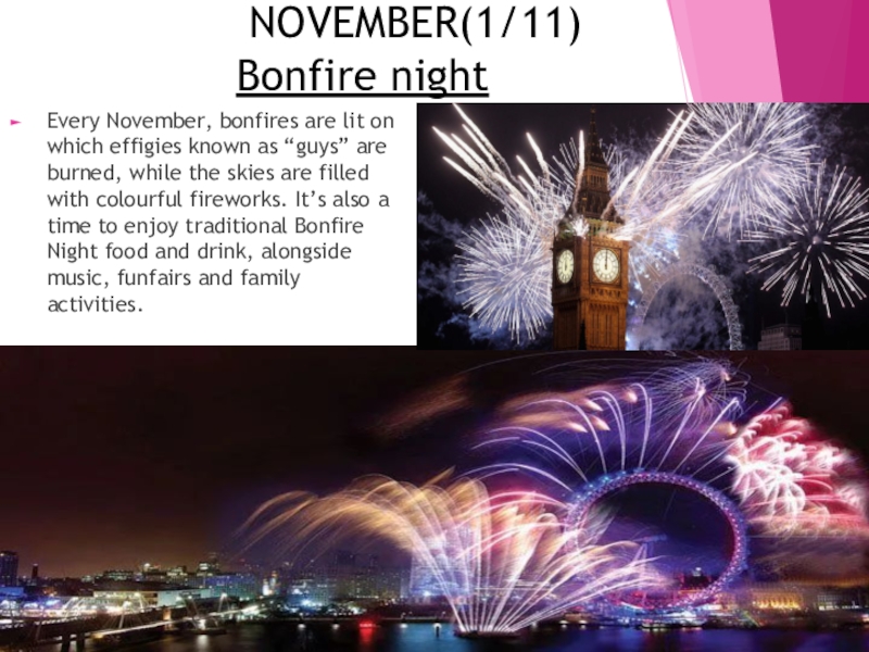 Every November, bonfires are lit on which effigies known as “guys” are burned, while the skies are filled with colourful fireworks. It’s also a time to enjoy traditional Bonfire Night food and drink, alongside music, funfairs and family activities.