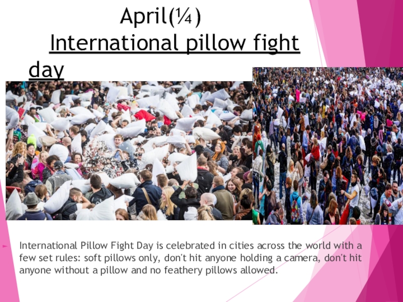 International Pillow Fight Day is celebrated in cities across the world with a few set rules: soft pillows only, don't hit anyone holding a camera, don't hit anyone without a pillow and no feathery pillows allowed.