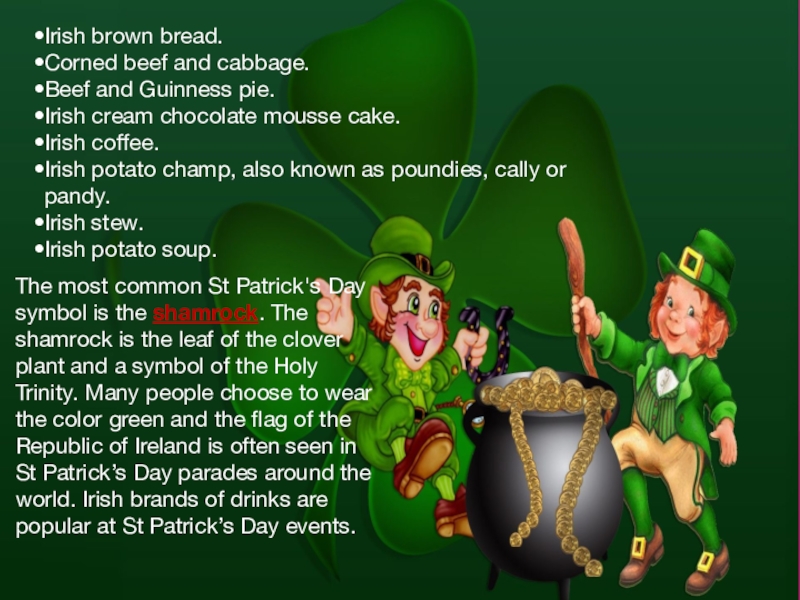 The most common St Patrick's Day symbol is the shamrock. The shamrock is the leaf of the clover plant and a symbol of the Holy Trinity. Many people choose to wear the color green and the flag of the Republic of Ireland is often seen in St Patrick’s Day parades around the world. Irish brands of drinks are popular at St Patrick’s Day events.