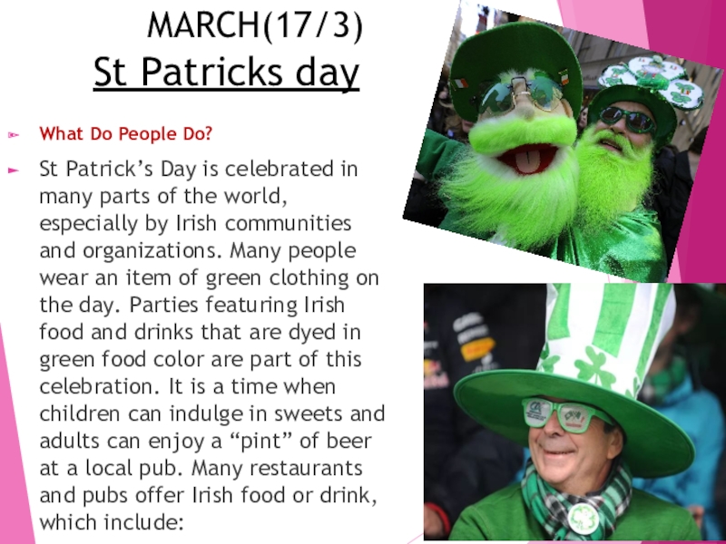 St Patrick’s Day is celebrated in many parts of the world, especially by Irish communities and organizations. Many people wear an item of green clothing on the day. Parties featuring Irish food and drinks that are dyed in green food color are part of this celebration. It is a time when children can indulge in sweets and adults can enjoy a “pint” of beer at a local pub. Many restaurants and pubs offer Irish food or drink, which include: