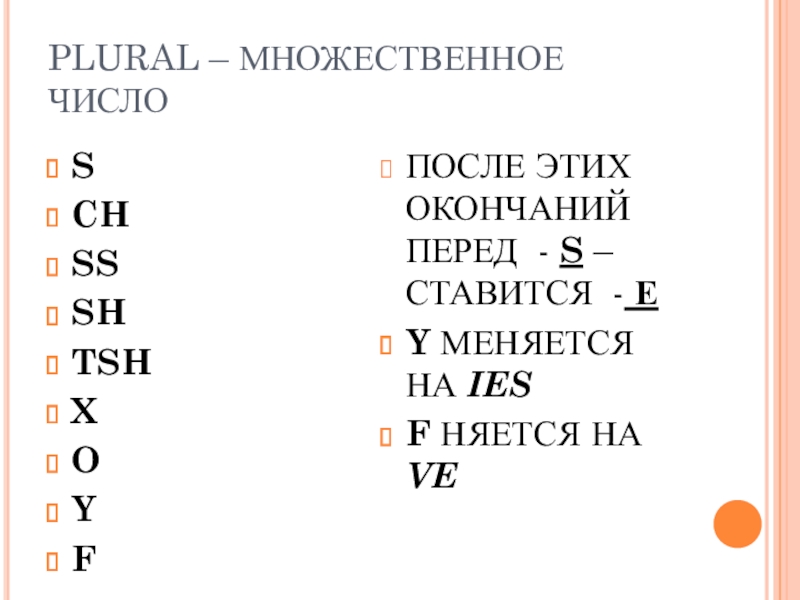 PLURAL – МНОЖЕСТВЕННОЕ ЧИСЛО SCHSSSHTSHXOY F ПОСЛЕ ЭТИХ ОКОНЧАНИЙ ПЕРЕД - S – СТАВИТСЯ - Е Y