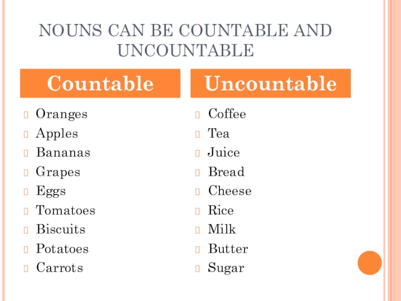 NOUNS CAN BE COUNTABLE AND UNCOUNTABLEOrangesApples BananasGrapesEggsTomatoesBiscuitsPotatoesCarrots CoffeeTeaJuiceBreadCheeseRiceMilkButterSugarCountableUncountable