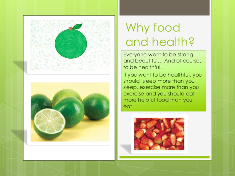 Why food and health?Everyone want to be strong and beautiful… And of course, to be healthful!If you want to be healthful, you should sleep more than you sleep, exercise more than you exercise and you should