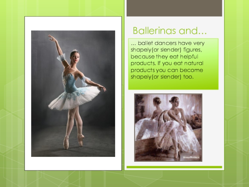 Ballerinas and…… ballet dancers have very shapely(or slender) figures, because they eat helpful products. If you eat